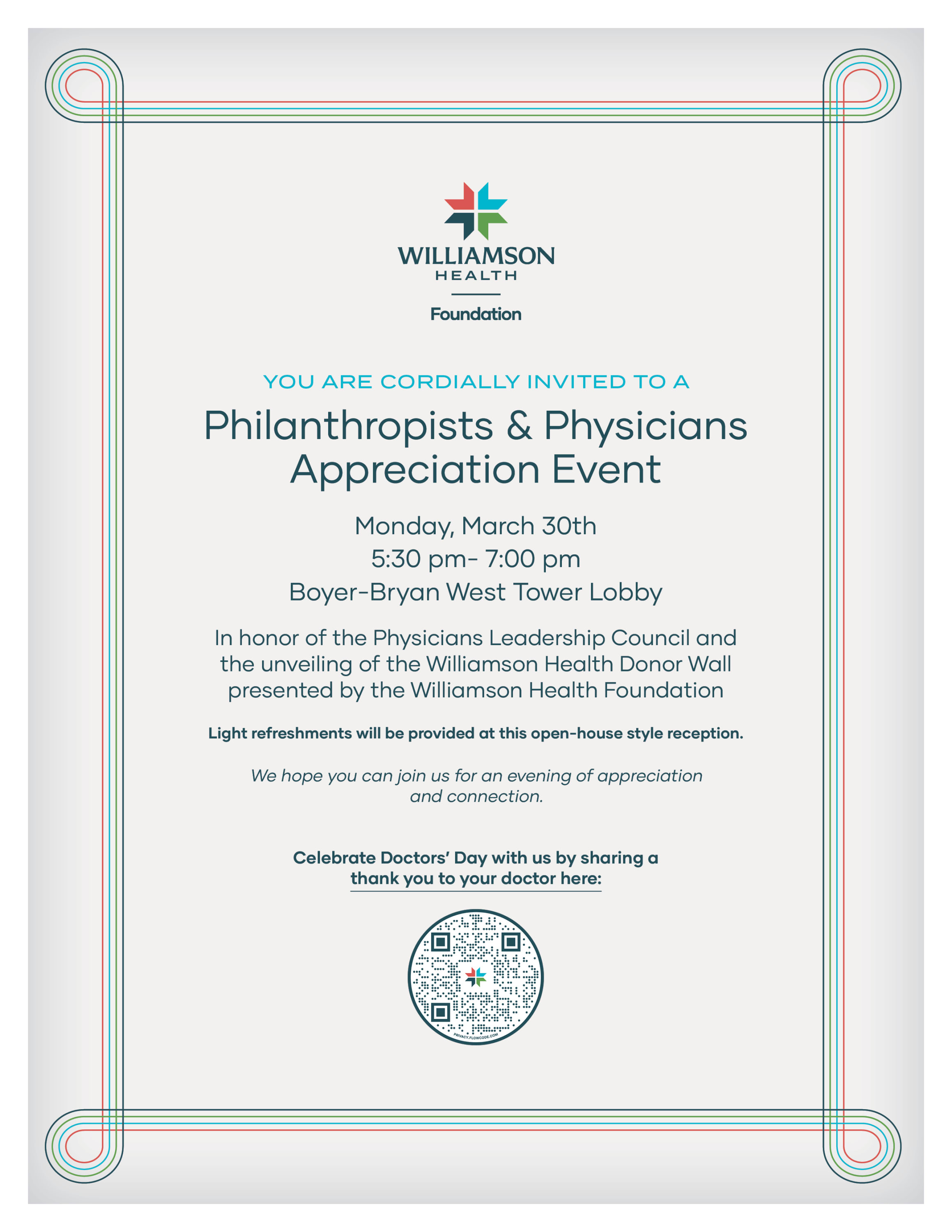 The Philanthropists & Physicians Appreciation Event, hosted by the Williamson Health Foundation, serves as an opportunity to thank our generous donors with the unveiling of the new donor wall, while also honoring the Physicians Leadership Council on Doctors’ Day, an observance dedicated to recognizing physicians for their commitment to patient well-being and the advancement of medicine. Through events like this ribbon cutting, the Williamson Health Foundation continues to celebrate the individuals whose leadership, compassion and generosity strengthen healthcare in our community. The event is open to the public and light refreshments will be provided.